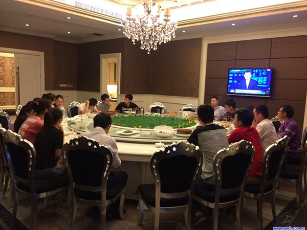 會(huì)議結(jié)束后,全體員工歡聚一堂,餐桌上談笑風(fēng)生,暢所欲言。