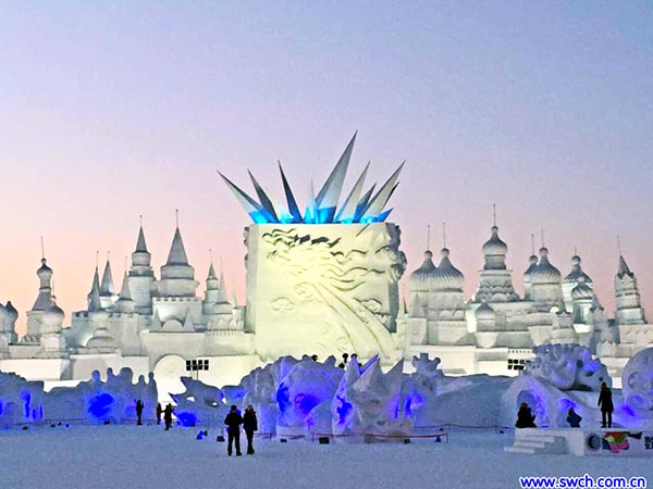 作品固然令人驚嘆,讓我們同樣不可忽視的是美輪美奐的自然美景。場地的一邊是成排的冰雕松樹,厚厚的被冰雪覆蓋的松葉與松樹尖針般的樹尖在各種大氣橫生的冰雕中顯得分外可愛、清秀。